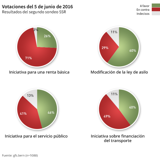 El segundo sondeo del Instituto de Investigación gfs.bern, muestra que la iniciativa sobre el servicio público tiene un futuro incierto, mientras que sus compañeras 'Por una renta básica incondicional' y 'Por un financiameinto equitable de los transportes', serían rechazadas. La Ley de Asilo, podría tener el respaldo ciudadano.