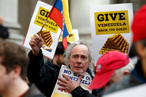 «¡Banco de Inglaterra, te lo hemos dicho, devuelve el oro a Venezuela!», gritaban mientras un manifestante, caracterizado como el presidente estadounidense Donald Trump, acariciaba dos falsos lingotes de oro bajo una gran bandera de Venezuela.