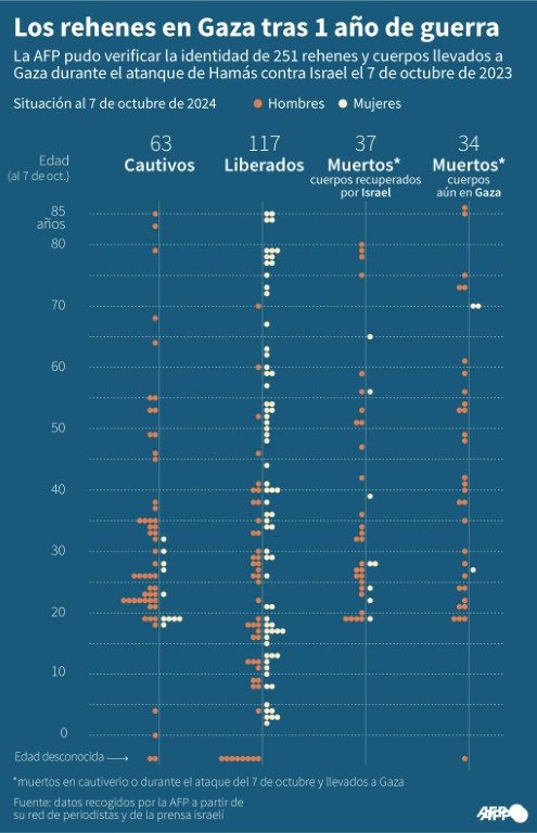 Hasta el 7 de octubre de 2024, de los 251 rehenes y cuerpos trasladados a Gaza el 7 de octubre de 2023, 117 fueron liberados –principalmente mujeres, niños y trabajadores extranjeros–, 97 siguen retenidos, 63 de los cuales se cree que están vivos y 34 fueron declarados muertos por el ejército israelí o el Foro de Familias de Rehenes. El deceso de Idan Shtivi (28 años) fue anunciado este lunes.