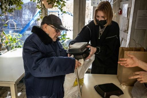 «Esto es lo que podemos hacer», dice Dmitro Kostrubin, de 42 años, responsable de desarrollo del establecimiento, mientras varias personas mayores están comiendo en bandejas de poliestireno.