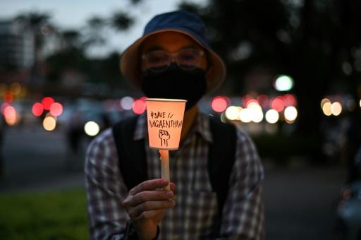 Un activista sostiene una vela durante una vigilia contra la ejecución de Nagaenthran K. Dharmalingam, el 8 de noviembre de 2021 en Kuala Lumpur, frente a la Embajada de Singapur en Malasia afp_tickers