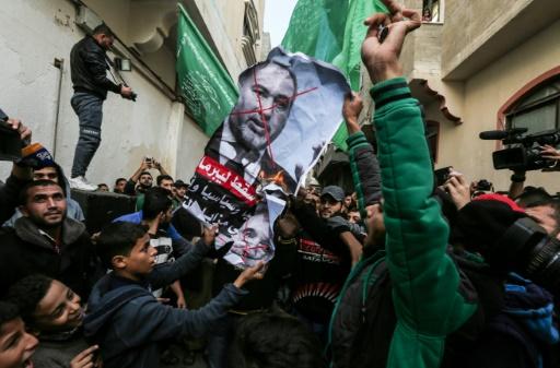 Manifestantes palestinos queman fotos del ministro de Defensa israelí Avigdor Lieberman, frente a la casa de Ismail Haniya, líder de Hamas, en Gaza el 14 de noviembre de 2018 afp_tickers