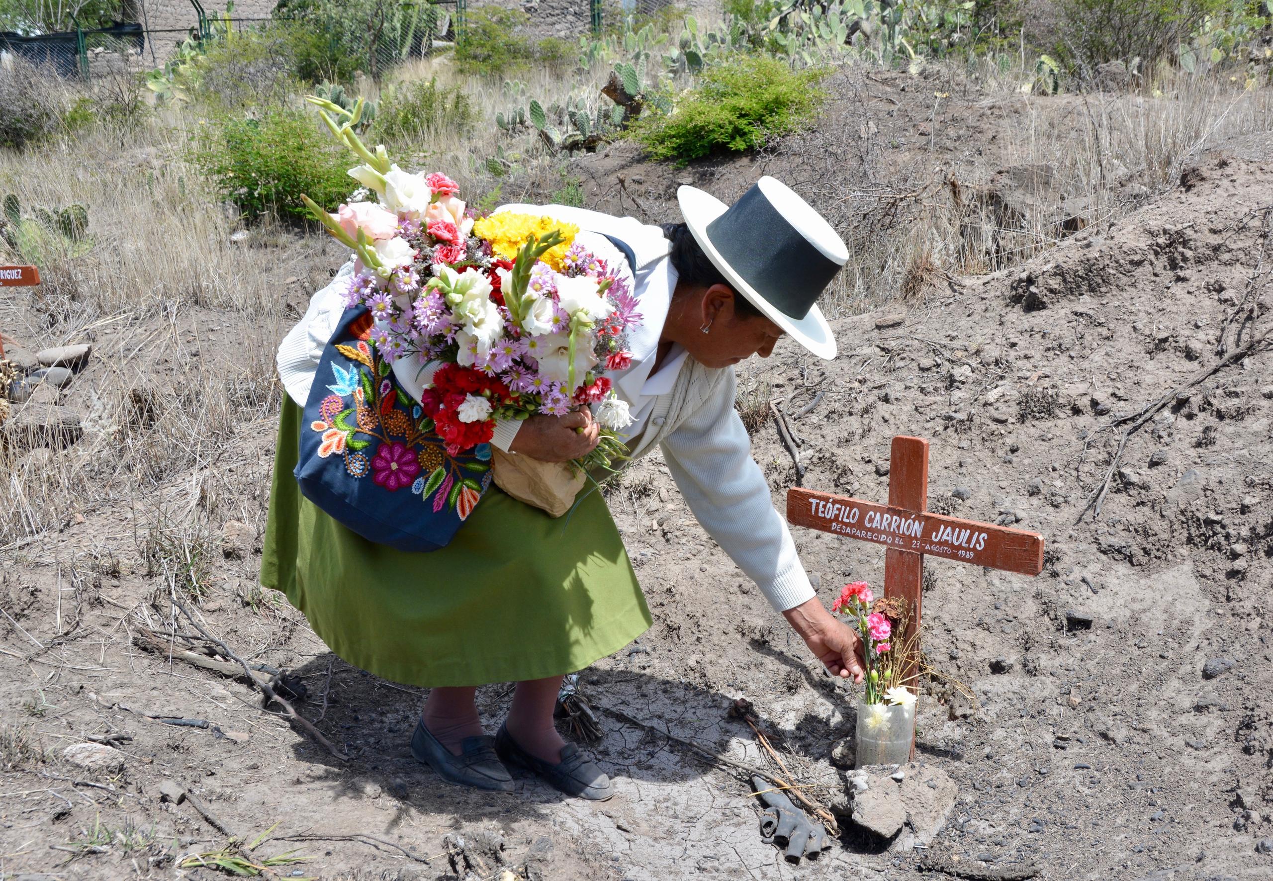 “Hasta hoy, sigo sin saber dónde pudieran haberlo llevado. Quizás fue aquí”, dice Juana Carrión mientras coloca delicadamente un ramillete de claveles sobre una cruz simbólica con el nombre de su hermano ubicada en una zona árida y llena de zanjas cuadriculadas de las afueras de Ayacucho, 330 kilómetros al suroeste de Lima, la capital peruana.