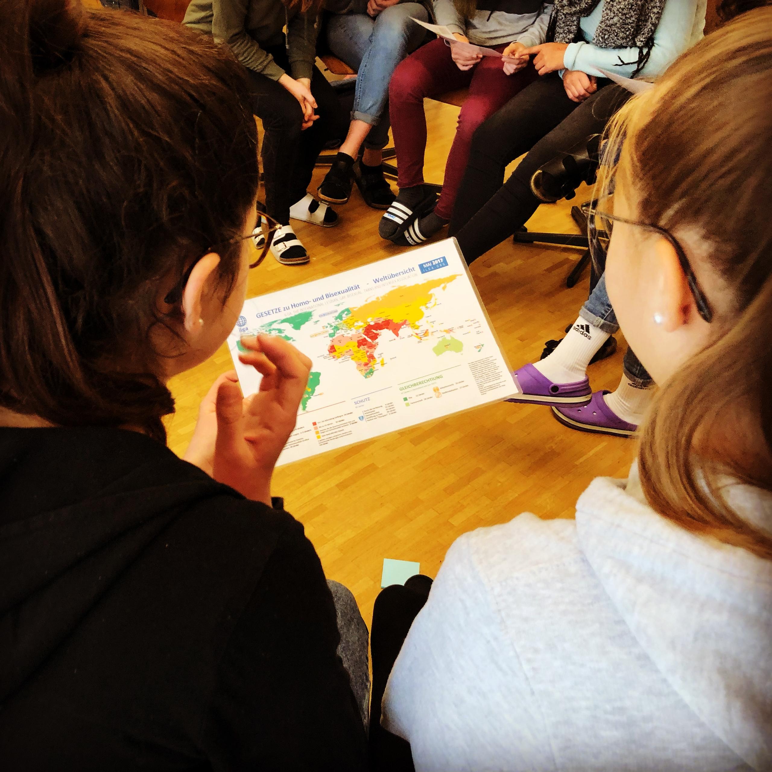 Las risas avergonzadas o las furtivas miradas de burla van cediendo paulatinamente para dar paso a una atmósfera relajada y propicia para el diálogo. “Yo soy de origen ruso y en mi país, uno aprende en la escuela que la homosexualidad está prohibida. Algunas veces, los niños ni siquiera saben que existe”, cuenta una joven, ante la mirada atónita de sus camaradas. La clase también se sorprende cuando descubre un mapaEnlace externo que incluye a los 72 países que aún castigan la homosexualidad. En ocho de ellos, ser homosexual aún amerita pena de muerte, así que en algunos de estos países la vida de los miembros de la asociación ABQ estaría en riesgo.