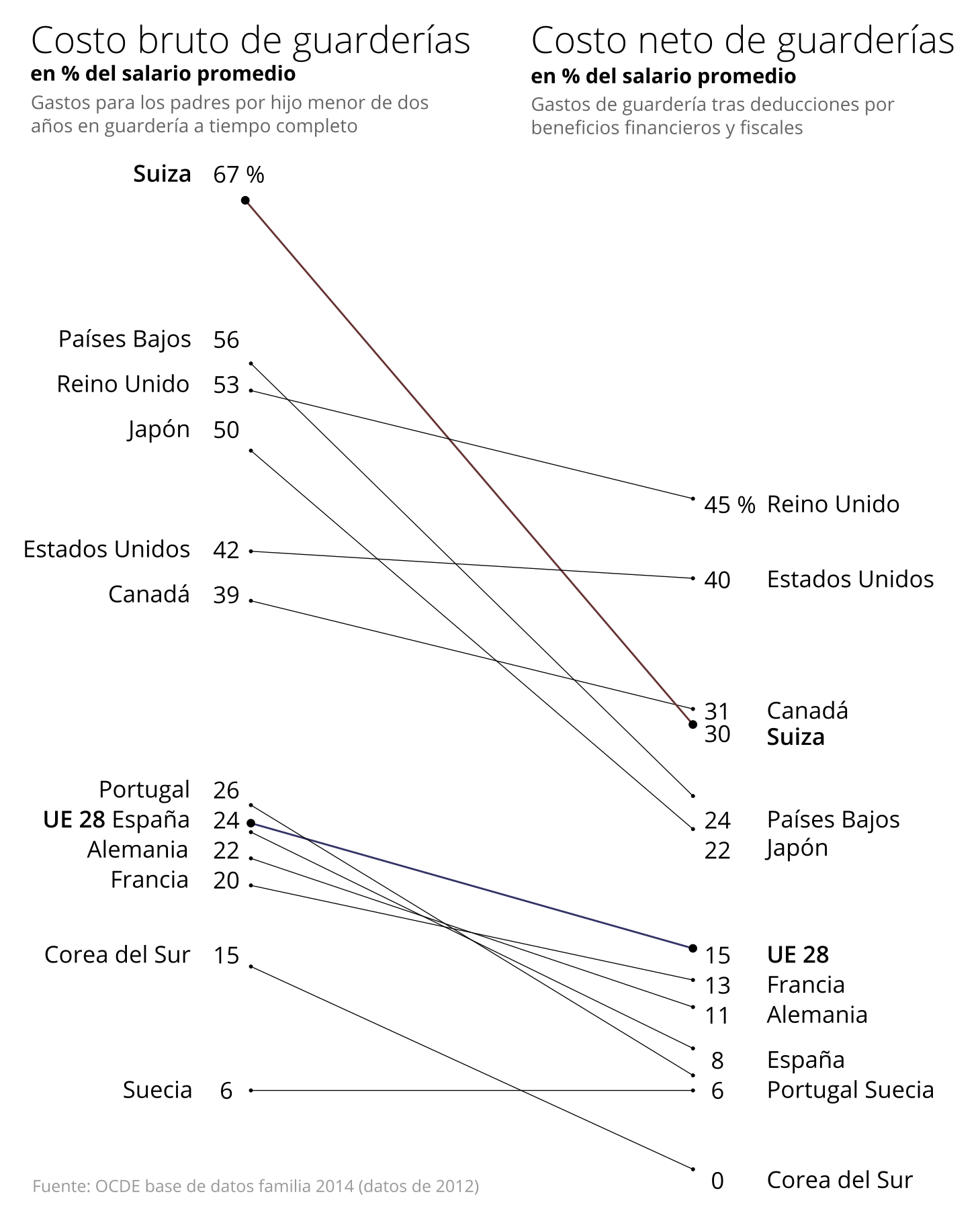 Estudios internacionales lo confirman. Con una factura que se eleva a dos terceras partes del salario promedio por una plaza de guardería a tiempo completo, Suiza se sitúa a la cabeza de los países de la OCDE en lo que atañe a los costos para el cuidado extrafamiliar.