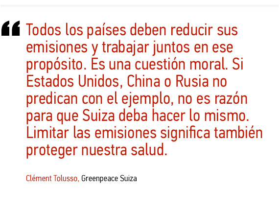 En Suiza, el principal responsable de las emisiones de CO2 es el tráfico. “Los automóviles y las instalaciones de calefacción no emiten solo CO2, sino también otras sustancias contaminantes”, puntualiza el portavoz de Greenpeace Suiza, Clément Tolusso.