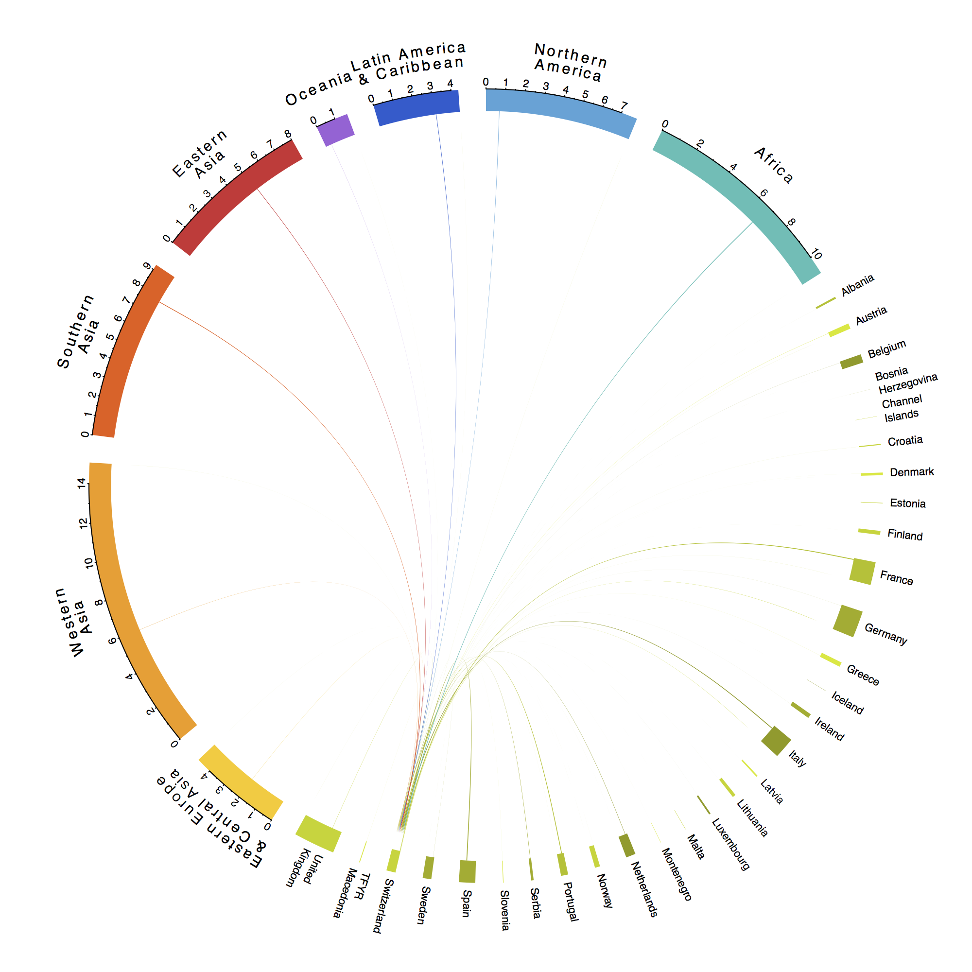 Esta visualización pone en perspectiva la típica mirada eurocéntrica que considera que todo el mundo trata de ir a Europa. Cierto, no se puede negar el actual desafío migratorio ante el actual flujo migratorio, pero las cifras indican que la gente que emigra a Europa representa solo una fracción del movimiento migratorio global.