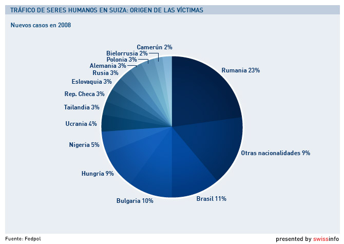 Según el documento, no habría personas de nacionalidad suiza afectadas, de lo que desprende la policía helvética que las víctimas son reclutadas desde sus países de origen por organizaciones de tráfico de seres humanos.