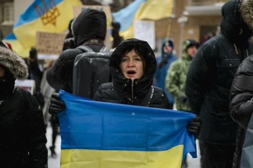 En Montreal, Canadá, decenas de personas no dudaron el viernes por la tarde en afrontar una tormenta de nieve para protestar bajo las ventanas del consulado general de Rusia.