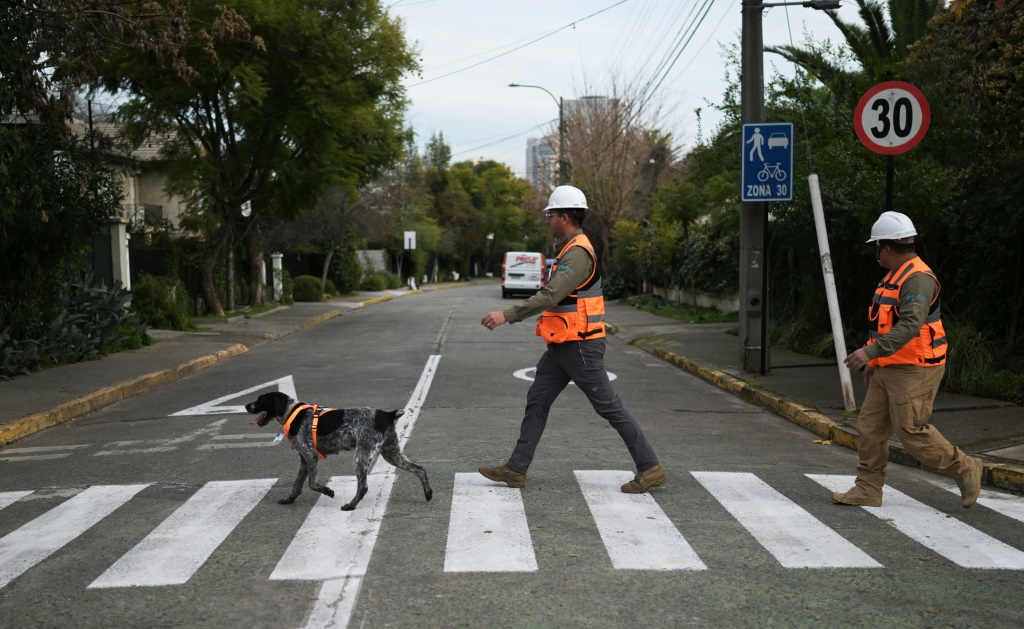 Frente a una universidad, Suki siente un olor y se inclina sobre sus patas, señal de que algo anda mal. Su potente olfato detecta cañerías rotas bajo tierra para evitar fugas de agua en la capital chilena, sumida en 15 años de sequía.