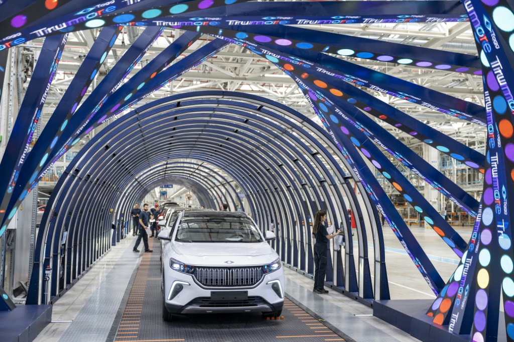 En un inmenso edificio turquesa y gris, unos brazos robóticos sueldan el habitáculo de pasajeros del primer vehículo todoterreno ligero de la marca, el SUV T10X, comercializado desde el año pasado.