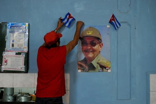 Un hombre pone unas banderas cubanas junto a una fotografía del presidente Raúl Castro en su negocio de La Habana, el 23 de febrero de 2017 afp_tickers