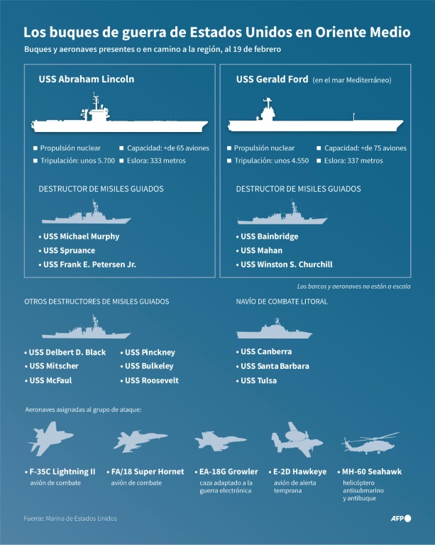 El ejército estadounidense cuenta actualmente con trece buques de guerra en Oriente Medio: un portaviones, el Abraham Lincoln, que llegó a finales de enero, nueve destructores y tres fragatas ligeras. Otros se dirigen a la región.