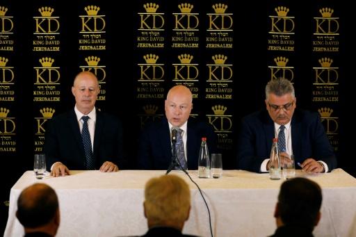 Jason Greenblatt (centro), el enviado del presidente de EEUU a Oriente Medio, asiste a una rueda de prensa en Jerusalén junto a un responsable israelí, Tzachi Hanegbi (izda.), y otro palestino, Mazen Ghoneim, el 13 de julio de 2017 afp_tickers