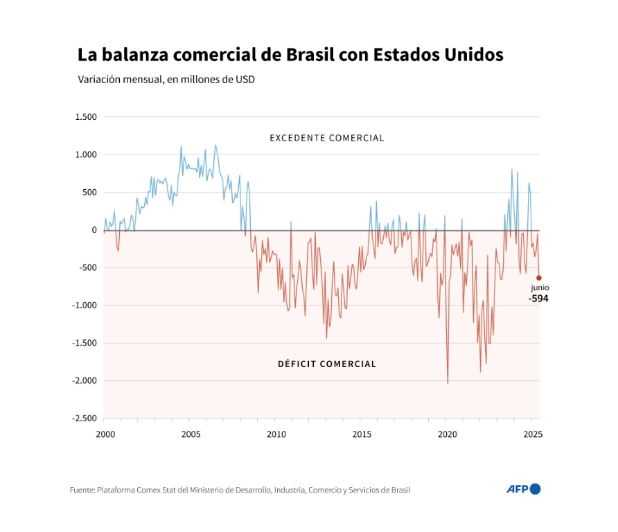 Brasil figura con un 10%, pero será solo hasta el 6 de agosto. El miércoles el gobierno de Trump anunció que a este arancel mínimo universal añadirá 40 puntos porcentuales (pp), lo que equivale a un 50%, debido sobre todo al juicio contra el expresidente ultraderechista Jair Bolsonaro, acusado de intentona golpista.