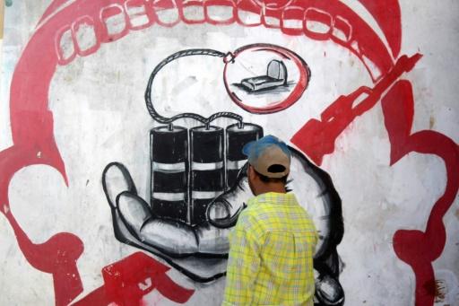 En la pared de una tienda de una zona que muy golpeada por la violencia, dibujó el rostro de un hombre sin fisionomía, con tres cartuchos de dinamita en lugar de facciones.