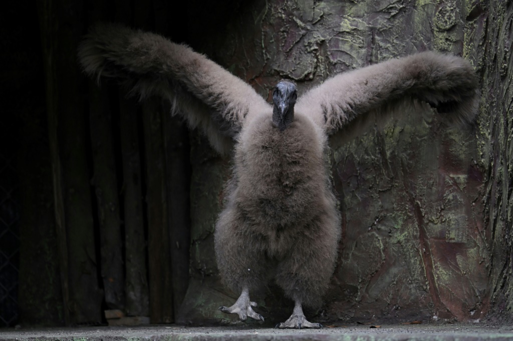 El polluelo ya tiene un metro y medio de envergadura y pesa 7.65 kilos. Tardará unos 8 años en desarrollar el pelaje negro y los tres metros de envergadura que caracterizan a una de las aves voladoras más grandes del mundo.
