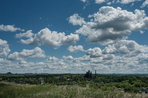 Detrás de él yacen las ruinas de una fábrica y de otros edificios alcanzados por las bombas.