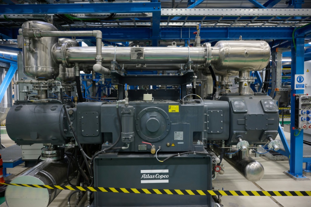 El dióxido de carbono, principal responsable del calentamiento climático, es separado del vapor y comprimido en un hangar donde se entrecruzan enormes tuberías.