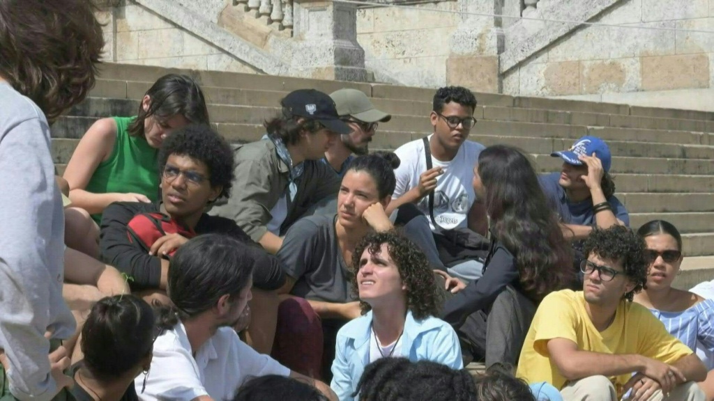 Sentados en la escalinata de la céntrica Universidad de La Habana (UH), los jóvenes protestaron por las dificultades para acceder a internet durante las clases a distancia, implementadas en la isla desde el 6 de febrero, como parte de un paquete de medidas de emergencia.