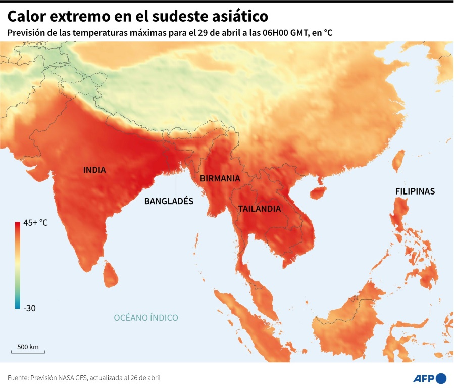En Bangladés no se prevé que bajen antes del jueves y en Tailandia la previsión es que las lluvias anuales no lleguen antes de finales de mayo, semanas más tarde de lo habitual.