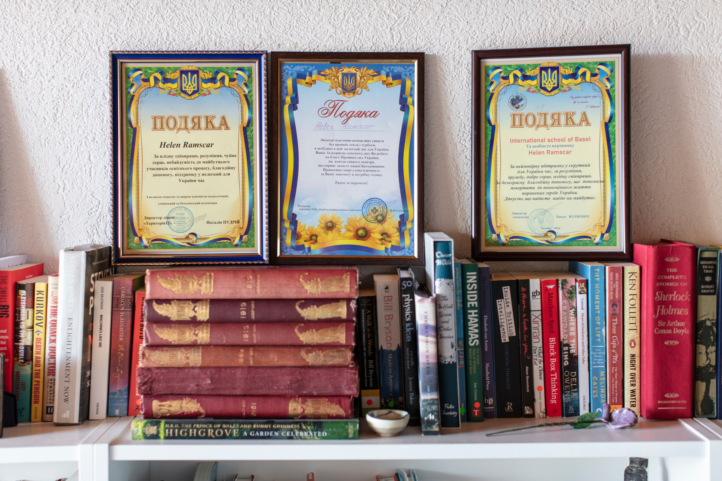 Сьогодні скрізь в її будинку можна бачити символи і знаки подяки, включно зі строкатими сертифікатами українською мовою, надісланими кількома одержувачами пожертвувань за лінією проекту Ambulance Relief. За свою благодійну діяльність вона також отримала дві нагороди від посольства Великої Британії в Берні.